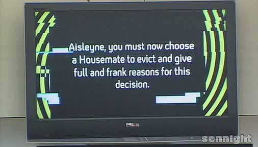 The first "shock" of the HND occurs at 1.17pm. Big Brother asks Aisleyne to gather all Housemates in the living room. The eviction process begins as Aisleyne is told to choose one Housemate to be evicted.