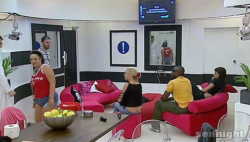 Everyone is subdued until Michael says "babes I'll go", this relieves some tension and amuses the other housemates, especially Jayne and Jennie.