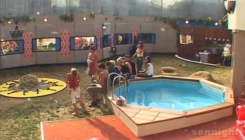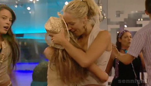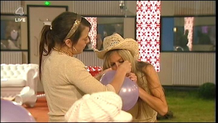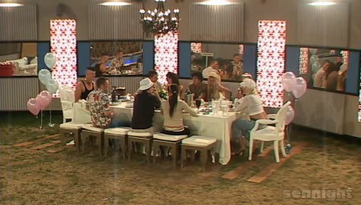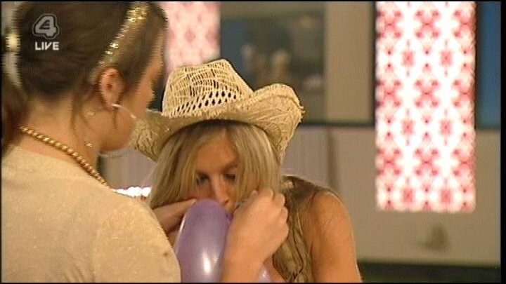 At 12.20am. Big brother plays music into the house and the housemates party party party!! Jennie and Aisleyne see Mikey and Imogen getting close. They start to sing 'Mikey and Imogen sitting in a tree...K.I.S.S.I.N.G'.