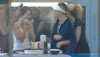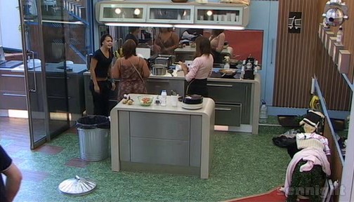Most of the housemates are in the kitchen. Nikki is talking to Jennie about